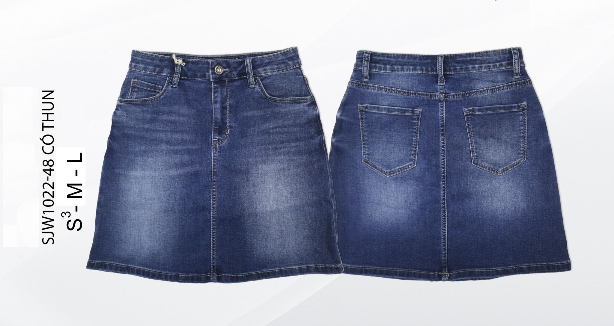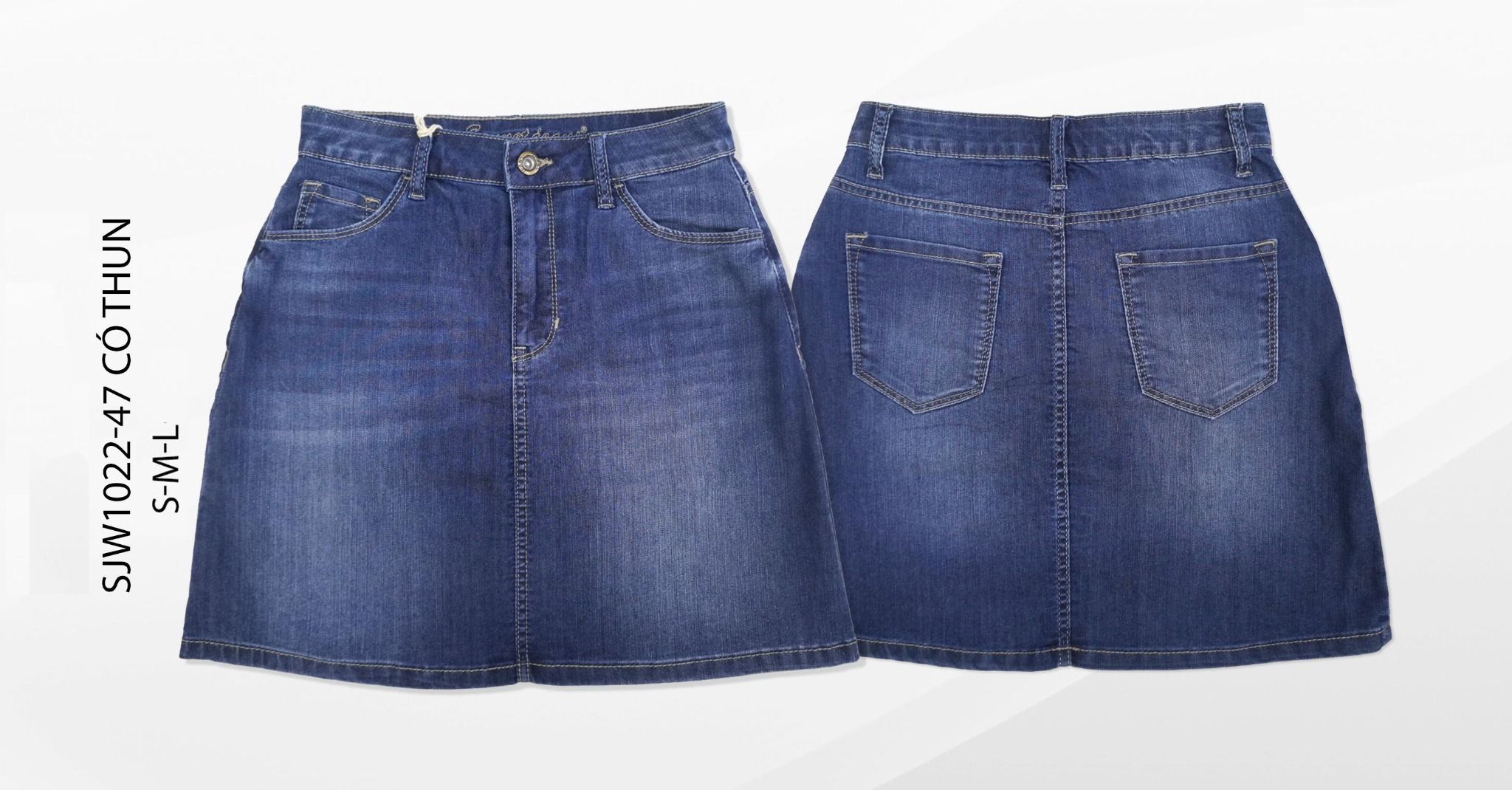 - Đặc điểm: Chân váy jeans màu đậm ngang gối xẻ tà